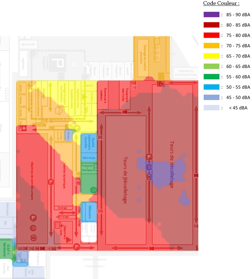 | L'opération : L’établissement est une usine d’opérations de décolletage situé sur la commune de Cluses en Haute-Savoie. L’espace de travail est divisée en plusieurs zones, accueillant une cinquantaine de travailleurs. Coût de l'opération : NC €   | Prestation réalisée par Phoenix Acoustique : Phoenix Acoustique intervient pour évaluer les niveaux sonores auxquels sont soumis les salariés de l’établissement concerné, à différents postes de travail. Plus particulièrement, Phoenix Acoustique a réalisé : - une cartographie en couleurs des niveaux sonores au sein de l'établissement, - une campagne de mesure par dosimétrie aux postes de travail les plus impactés par le bruit. Prestation terminée en 2024 |